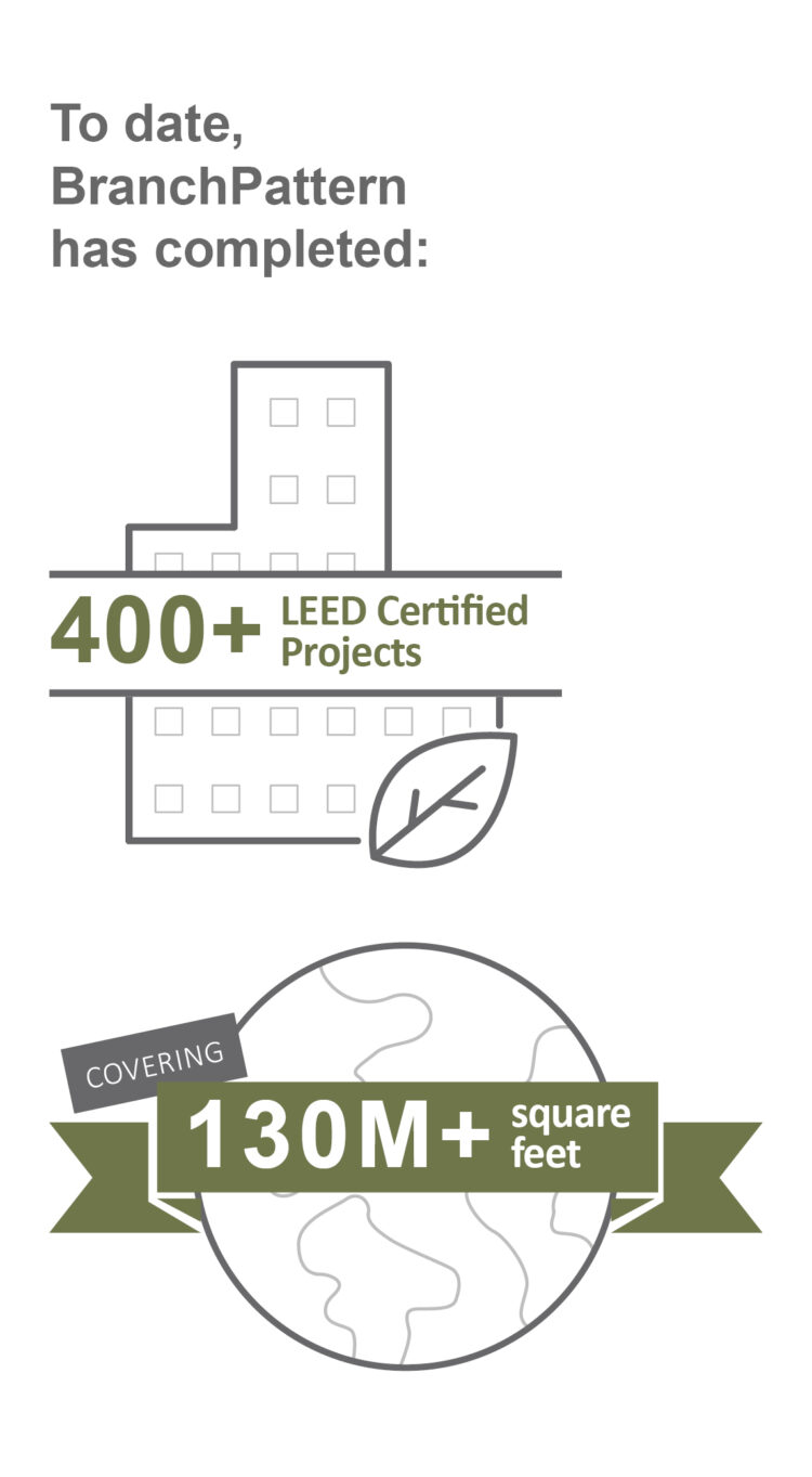 It’s easier for the project teams (architects, engineers, contractors, etc.) because they have a strong leader with a clear understanding of what’s needed from the very onset of the project. At the portfolio level, the certification blueprint is pre-determined, so there is less time spent evaluating which points are achievable for each project. Also, project teams are not required to use LEED Online or fill out any documentation! Therefore, no previous experience with LEED is required for your project teams, which can also lower the cost. BranchPattern provides the necessary requirements from the project kick-off and integrates the requirements into standard design deliverables and construction processes.